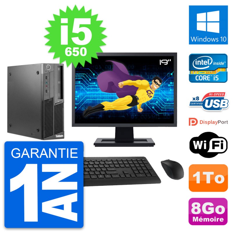 PC Lenovo M90 SFF - Intel Core i5-650 3.2 Ghz (4 Mo) - 8 Go DDR3 - Disque Dur 3,5" 1 To - Graveur DVD - Clef Wifi USB - Windows 10 - Livré avec Ecran 19" + clavier + souris (Marques et modèles variables) - Garantie 1 an.