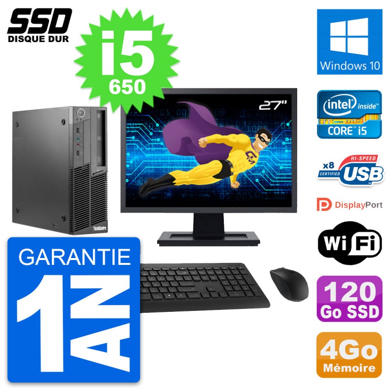 PC Lenovo M90 SFF - Intel Core i5-650 3.2 Ghz (4 Mo) - 4 Go DDR3 - Disque Dur SSD 120 Go - Graveur DVD - Clef Wifi USB - Windows 10 - Livré avec Ecran 27" + clavier + souris (Marques et modèles variables) - Garantie 1 an.