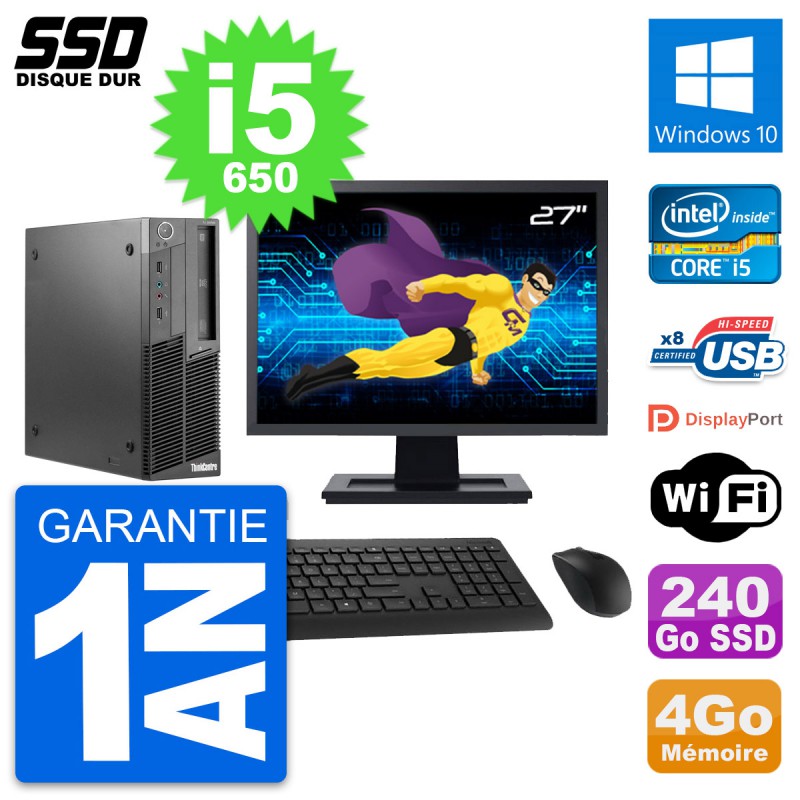 PC Lenovo M90 SFF - Intel Core i5-650 3.2 Ghz (4 Mo) - 4 Go DDR3 - Disque Dur SSD 240 Go - Graveur DVD - Clef Wifi USB - Windows 10 - Livré avec Ecran 27" + clavier + souris (Marques et modèles variables) - Garantie 1 an.