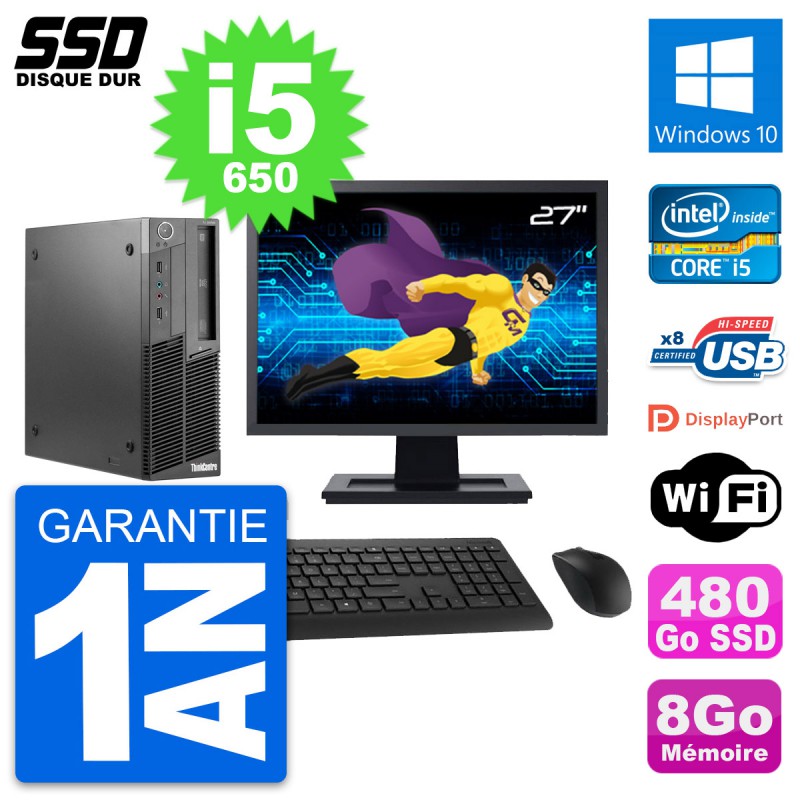 PC Lenovo M90 SFF - Intel Core i5-650 3.2 Ghz (4 Mo) - 8 Go DDR3 - Disque Dur SSD 480 Go - Graveur DVD - Clef Wifi USB - Windows 10 - Livré avec Ecran 27" + clavier + souris (Marques et modèles variables) - Garantie 1 an.