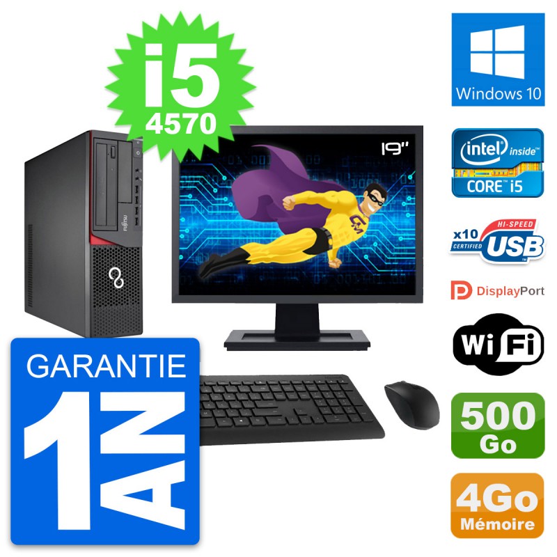 PC Fujitsu E720 DT - Intel Core i5-4570 3.2 Ghz (6 Mo) - 4 Go DDR3 - Disque Dur 3,5" 500 Go - Graveur DVD - Clef Wifi USB - Windows 10 - Livré avec Ecran 19" + clavier + souris (Marques et modèles variables) - Garantie 1 an.