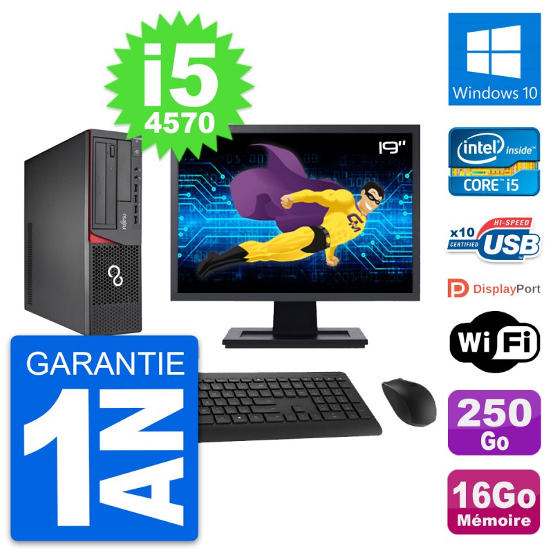 PC Fujitsu E720 DT - Intel Core i5-4570 3.2 Ghz (6 Mo) - 16 Go DDR3 - Disque Dur 3,5" 250 Go - Graveur DVD - Clef Wifi USB - Windows 10 - Livré avec Ecran 19" + clavier + souris (Marques et modèles variables) - Garantie 1 an.