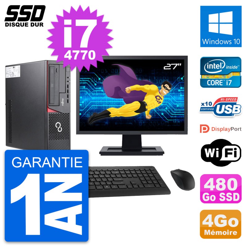 PC Fujitsu E720 DT - Intel Core i7-4770 3.4 Ghz (8 Mo) - 4 Go DDR3 - Disque Dur SSD 480 Go - Graveur DVD - Clef Wifi USB - Windows 10 - Livré avec Ecran 27" + clavier + souris (Marques et modèles variables) - Garantie 1 an.