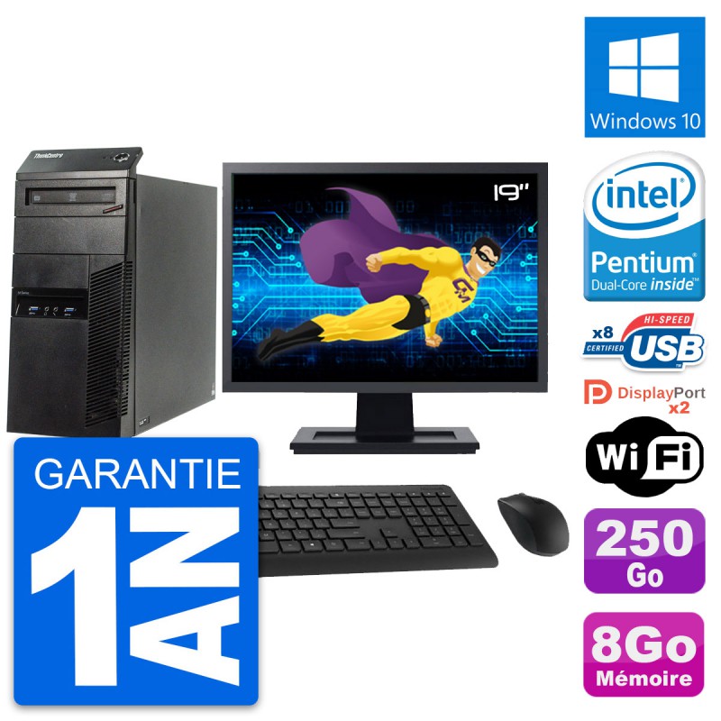 PC Tour Lenovo ThinkCentre M83 - Intel Pentium G3220 3.0 Ghz (3 Mo) - 8 Go DDR3 - Disque Dur 3,5" 250 Go - Graveur DVD - Clef Wifi USB - Windows 10 - Livré avec Ecran 19" + clavier + souris (Marques et modèles variables) - Garantie 1 an.
