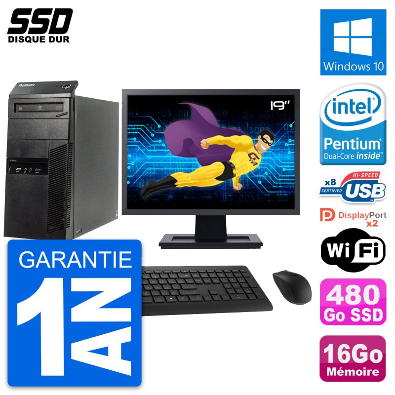 PC Tour Lenovo ThinkCentre M83 - Intel Pentium G3220 3.0 Ghz (3 Mo) - 16 Go DDR3 - Disque Dur SSD 480 Go - Graveur DVD - Clef Wifi USB - Windows 10 - Livré avec Ecran 19" + clavier + souris (Marques et modèles variables) - Garantie 1 an.