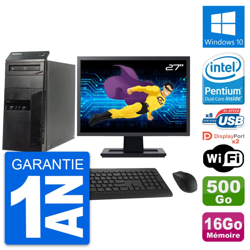 PC Tour Lenovo ThinkCentre M83 - Intel Pentium G3220 3.0 Ghz (3 Mo) - 16 Go DDR3 - Disque Dur 3,5" 500 Go - Graveur DVD - Clef Wifi USB - Windows 10 - Livré avec Ecran 27" + clavier + souris (Marques et modèles variables) - Garantie 1 an.