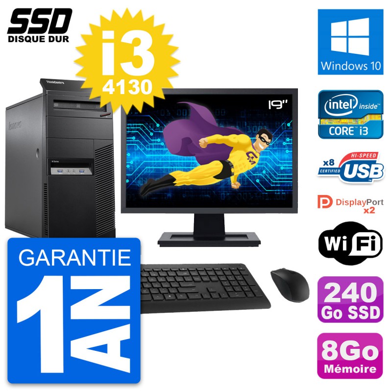 PC Tour Lenovo ThinkCentre M83 - Intel Core i3-4130 3.4 Ghz (3 Mo) - 8 Go DDR3 - Disque Dur SSD 240 Go - Graveur DVD - Clef Wifi USB - Windows 10 - Livré avec Ecran 19" + clavier + souris (Marques et modèles variables) - Garantie 1 an.