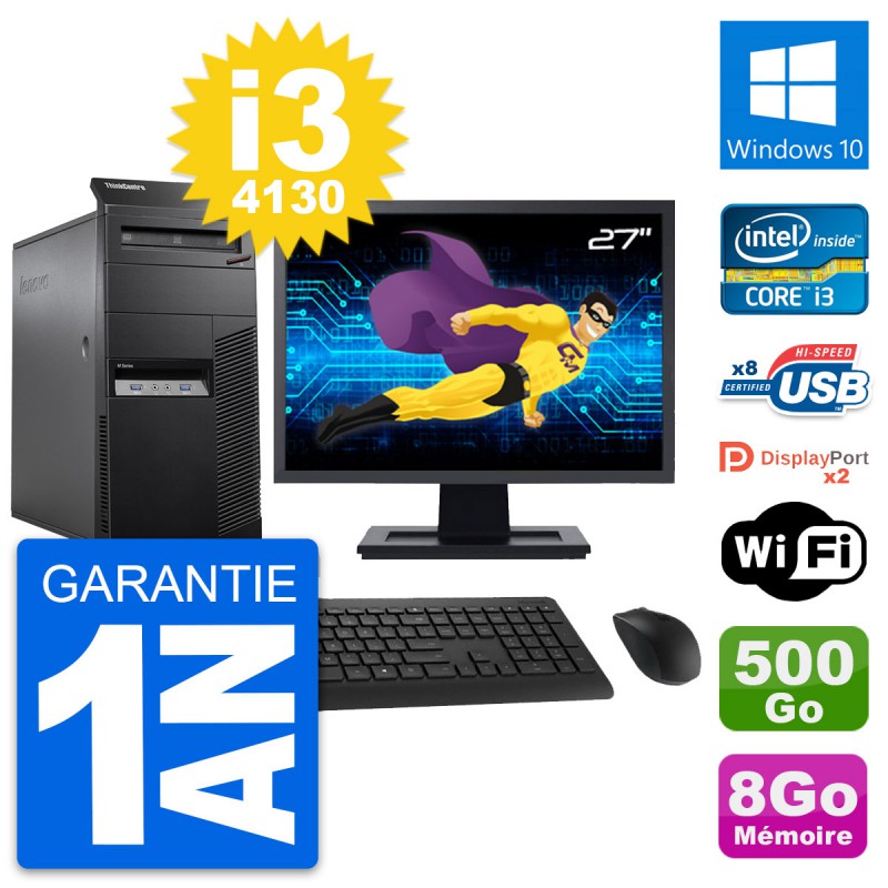 PC Tour Lenovo ThinkCentre M83 - Intel Core i3-4130 3.4 Ghz (3 Mo) - 8 Go DDR3 - Disque Dur 3,5" 500 Go - Graveur DVD - Clef Wifi USB - Windows 10 - Livré avec Ecran 27" + clavier + souris (Marques et modèles variables) - Garantie 1 an.