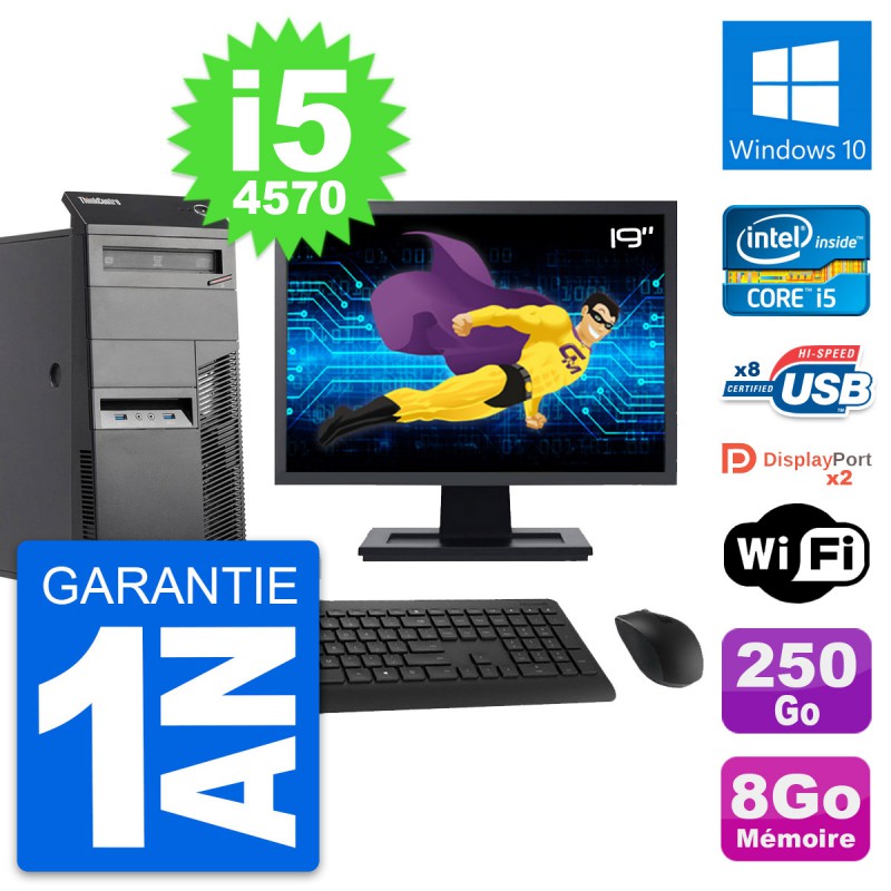 PC Tour Lenovo ThinkCentre M83 - Intel Core i5-4570 3.2 Ghz (6 Mo) - 8 Go DDR3 - Disque Dur 3,5" 250 Go - Graveur DVD - Clef Wifi USB - Windows 10 - Livré avec Ecran 19" + clavier + souris (Marques et modèles variables) - Garantie 1 an.