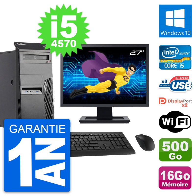 PC Tour Lenovo ThinkCentre M83 - Intel Core i5-4570 3.2 Ghz (6 Mo) - 16 Go DDR3 - Disque Dur 3,5" 500 Go - Graveur DVD - Clef Wifi USB - Windows 10 - Livré avec Ecran 27" + clavier + souris (Marques et modèles variables) - Garantie 1 an.