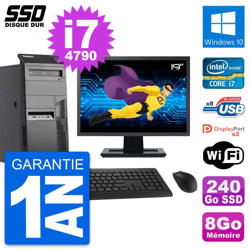 PC Tour Lenovo ThinkCentre M83 - Intel Core i7-4790 3.6 Ghz (8 Mo) - 8 Go DDR3 - Disque Dur SSD 240 Go - Graveur DVD - Clef Wifi USB - Windows 10 - Livré avec Ecran 19" + clavier + souris (Marques et modèles variables) - Garantie 1 an.