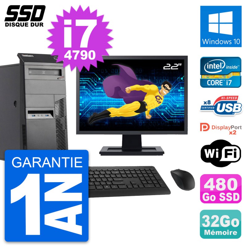 PC Tour Lenovo ThinkCentre M83 - Intel Core i7-4790 3.6 Ghz (8 Mo) - 32 Go DDR3 - Disque Dur SSD 480 Go - Graveur DVD - Clef Wifi USB - Windows 10 - Livré avec Ecran 22" + clavier + souris (Marques et modèles variables) - Garantie 1 an.