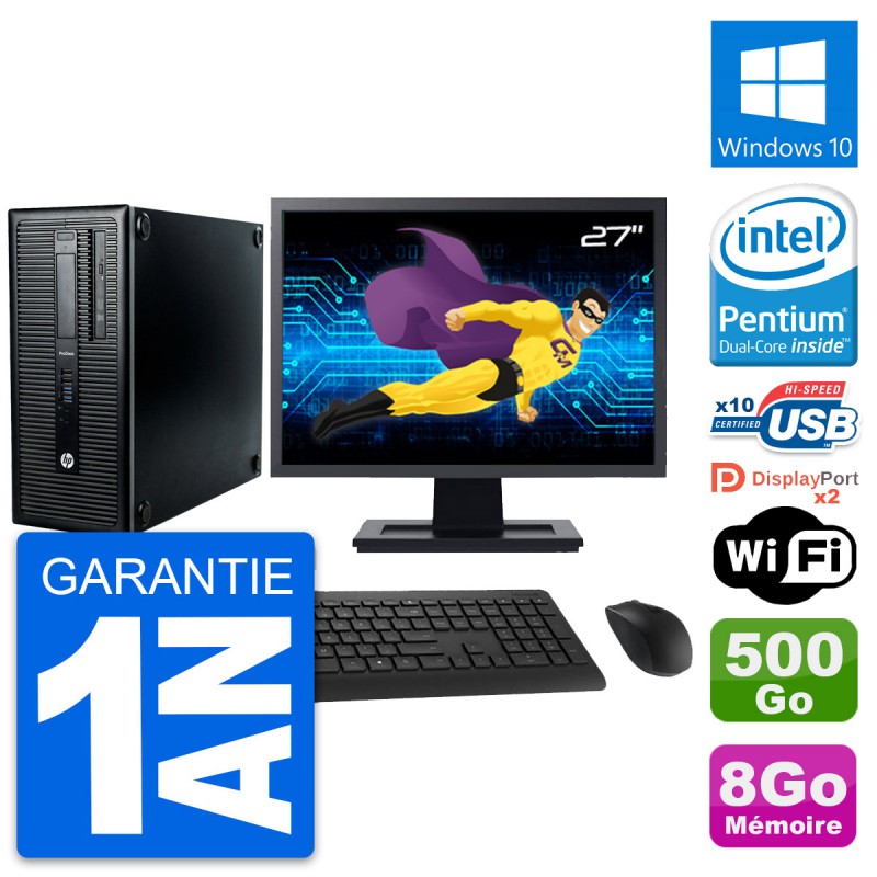 PC Tour HP ProDesk 600 G1 - Intel Pentium G3220 3.0 Ghz (3 Mo) - 8 Go DDR3 - Disque Dur 3,5" 500 Go - Graveur DVD - Clef Wifi USB - Windows 10 - Livré avec Ecran 27" + clavier + souris (Marques et modèles variables) - Garantie 1 an.