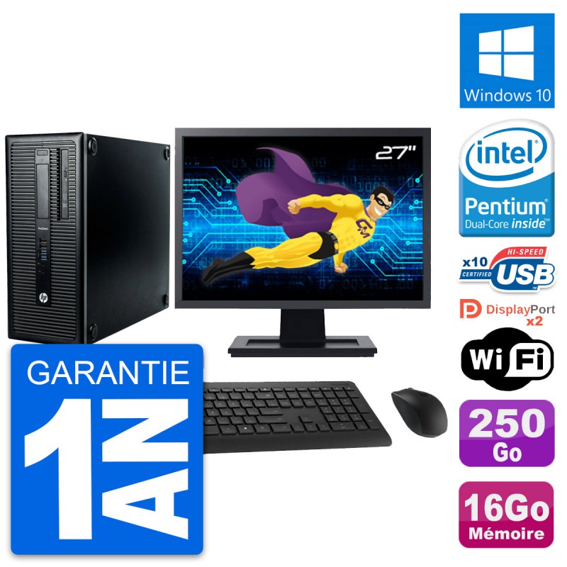 PC Tour HP ProDesk 600 G1 - Intel Pentium G3220 3.0 Ghz (3 Mo) - 16 Go DDR3 - Disque Dur 3,5" 250 Go - Graveur DVD - Clef Wifi USB - Windows 10 - Livré avec Ecran 27" + clavier + souris (Marques et modèles variables) - Garantie 1 an.
