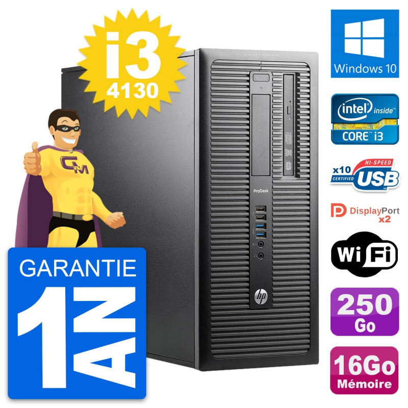 PC Tour HP ProDesk 600 G1 - Intel Core i3-4130 3.4 Ghz (3 Mo) - 16 Go DDR3 - Disque Dur 3,5" 250 Go - Graveur DVD - Clef Wifi USB - Windows 10 - Garantie 1 an.