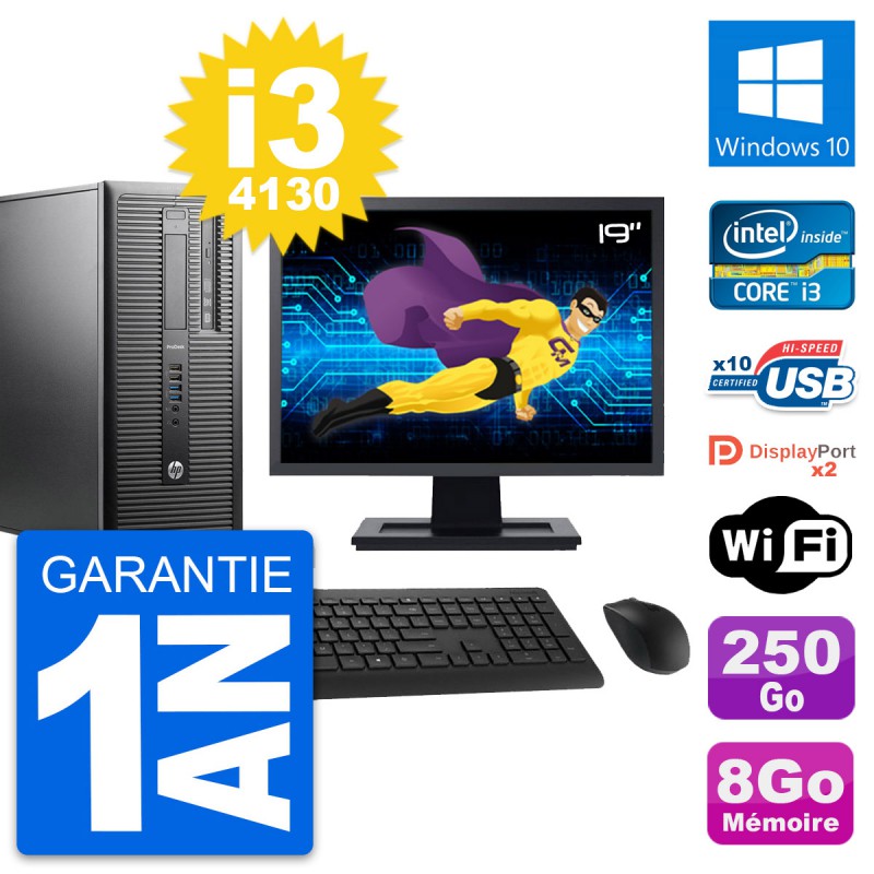 PC Tour HP ProDesk 600 G1 - Intel Core i3-4130 3.4 Ghz (3 Mo) - 8 Go DDR3 - Disque Dur 3,5" 250 Go - Graveur DVD - Clef Wifi USB - Windows 10 - Livré avec Ecran 19" + clavier + souris (Marques et modèles variables) - Garantie 1 an.