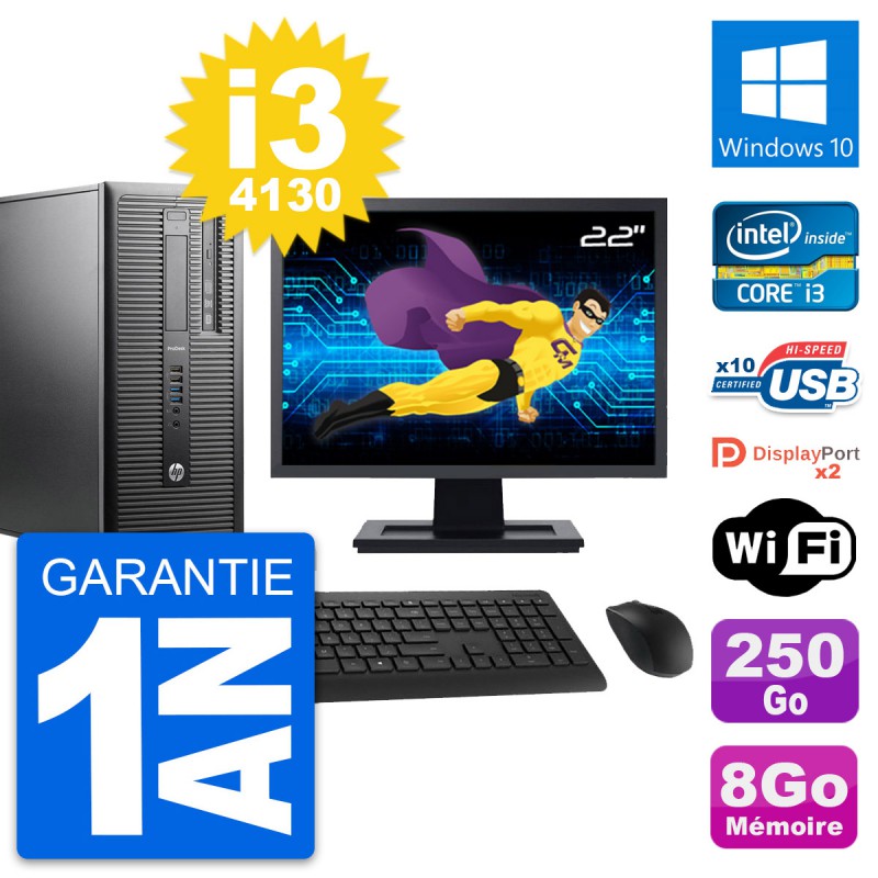 PC Tour HP ProDesk 600 G1 - Intel Core i3-4130 3.4 Ghz (3 Mo) - 8 Go DDR3 - Disque Dur 3,5" 250 Go - Graveur DVD - Clef Wifi USB - Windows 10 - Livré avec Ecran 22" + clavier + souris (Marques et modèles variables) - Garantie 1 an.