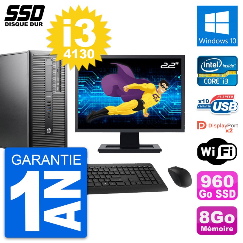 PC Tour HP ProDesk 600 G1 - Intel Core i3-4130 3.4 Ghz (3 Mo) - 8 Go DDR3 - Disque Dur SSD 960 Go - Graveur DVD - Clef Wifi USB - Windows 10 - Livré avec Ecran 22" + clavier + souris (Marques et modèles variables) - Garantie 1 an.