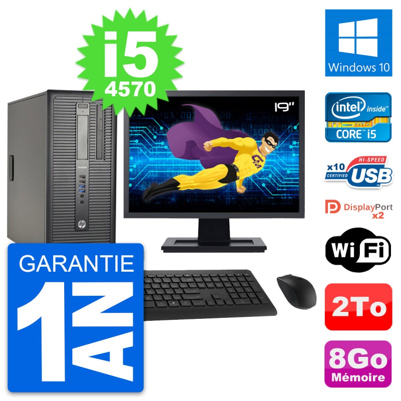 PC Tour HP ProDesk 600 G1 - Intel Core i5-4570 3.2 Ghz (6 Mo) - 8 Go DDR3 - Disque Dur 3,5" 2 To - Graveur DVD - Clef Wifi USB - Windows 10 - Livré avec Ecran 19" + clavier + souris (Marques et modèles variables) - Garantie 1 an.