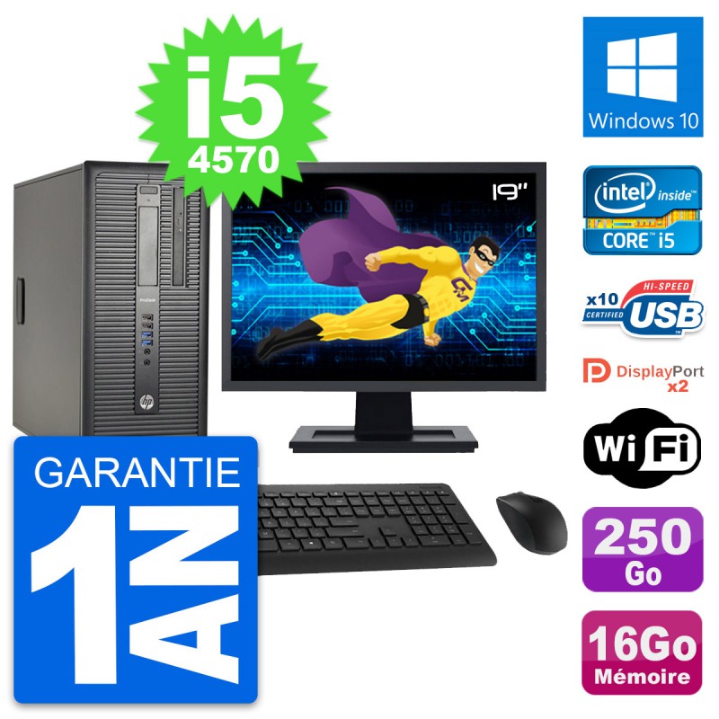 PC Tour HP ProDesk 600 G1 - Intel Core i5-4570 3.2 Ghz (6 Mo) - 16 Go DDR3 - Disque Dur 3,5" 250 Go - Graveur DVD - Clef Wifi USB - Windows 10 - Livré avec Ecran 19" + clavier + souris (Marques et modèles variables) - Garantie 1 an.