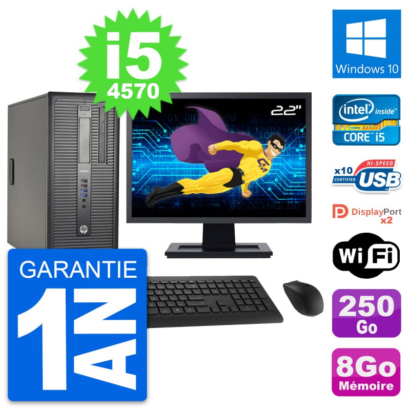 PC Tour HP ProDesk 600 G1 - Intel Core i5-4570 3.2 Ghz (6 Mo) - 8 Go DDR3 - Disque Dur 3,5" 250 Go - Graveur DVD - Clef Wifi USB - Windows 10 - Livré avec Ecran 22" + clavier + souris (Marques et modèles variables) - Garantie 1 an.