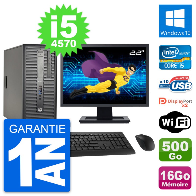 PC Tour HP ProDesk 600 G1 - Intel Core i5-4570 3.2 Ghz (6 Mo) - 16 Go DDR3 - Disque Dur 3,5" 500 Go - Graveur DVD - Clef Wifi USB - Windows 10 - Livré avec Ecran 22" + clavier + souris (Marques et modèles variables) - Garantie 1 an.