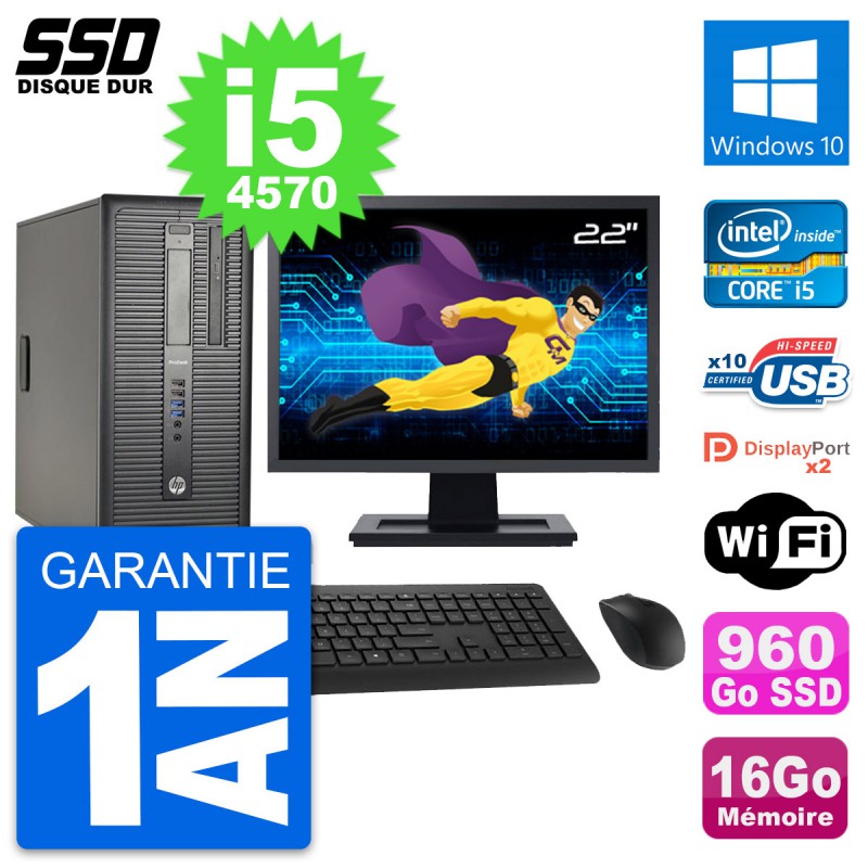 PC Tour HP ProDesk 600 G1 - Intel Core i5-4570 3.2 Ghz (6 Mo) - 16 Go DDR3 - Disque Dur SSD 960 Go - Graveur DVD - Clef Wifi USB - Windows 10 - Livré avec Ecran 22" + clavier + souris (Marques et modèles variables) - Garantie 1 an.