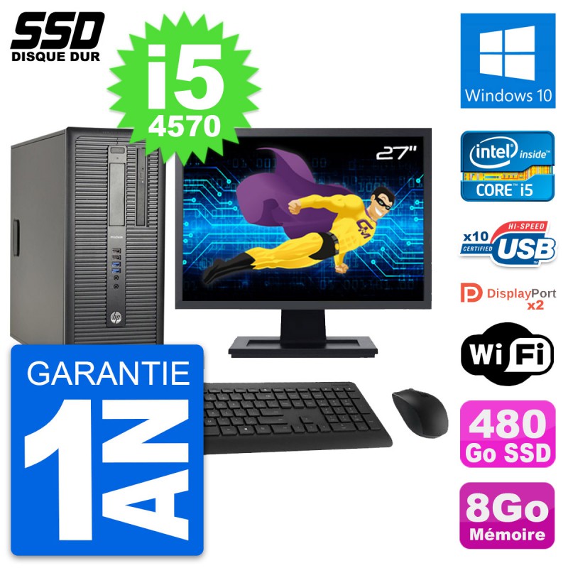 PC Tour HP ProDesk 600 G1 - Intel Core i5-4570 3.2 Ghz (6 Mo) - 8 Go DDR3 - Disque Dur SSD 480 Go - Graveur DVD - Clef Wifi USB - Windows 10 - Livré avec Ecran 27" + clavier + souris (Marques et modèles variables) - Garantie 1 an.