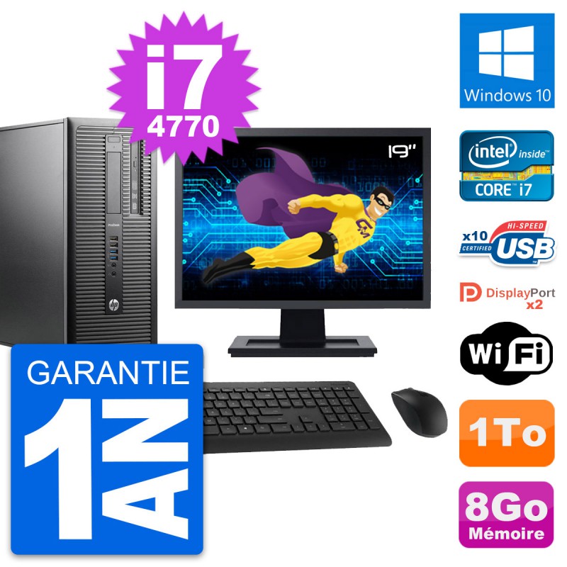 PC Tour HP ProDesk 600 G1 - Intel Core i7-4770 3.4 Ghz (8 Mo) - 8 Go DDR3 - Disque Dur 3,5" 1 To - Graveur DVD - Clef Wifi USB - Windows 10 - Livré avec Ecran 19" + clavier + souris (Marques et modèles variables) - Garantie 1 an.