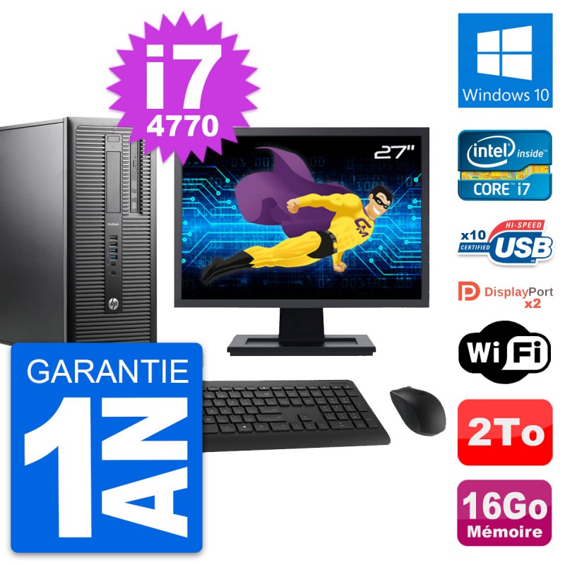 PC Tour HP ProDesk 600 G1 - Intel Core i7-4770 3.4 Ghz (8 Mo) - 16 Go DDR3 - Disque Dur 3,5" 2 To - Graveur DVD - Clef Wifi USB - Windows 10 - Livré avec Ecran 27" + clavier + souris (Marques et modèles variables) - Garantie 1 an.