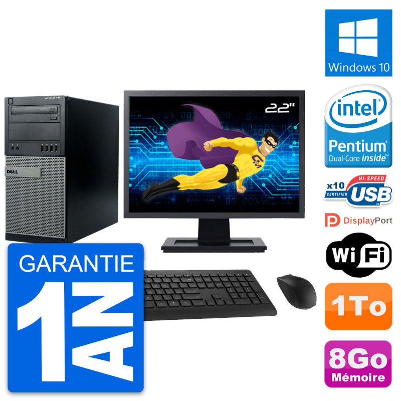 PC Tour Dell 790 MT - Intel Pentium Dual-Core G630 2.7 Ghz (3 Mo) - 8 Go DDR3 - Disque Dur 3,5" 1 To - Graveur DVD - Clef Wifi USB - Windows 10 - Livré avec Ecran 22" + clavier + souris (Marques et modèles variables) - Garantie 1 an.