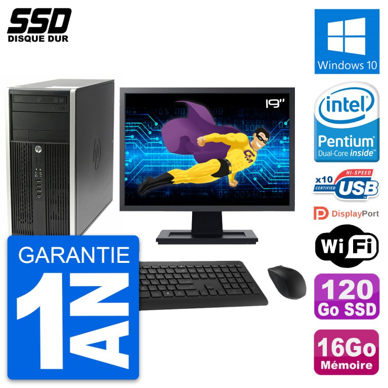 PC HP Pro 6200 CMT (Micro Tour) - Intel Pentium Dual-Core G630 2.7 Ghz (3 Mo) - 16 Go DDR3 - Disque Dur SSD 120 Go - Graveur DVD - Clef Wifi USB - Windows 10 - Livré avec Ecran 19" + clavier + souris (Marques et modèles variables) - Garantie 1 an.