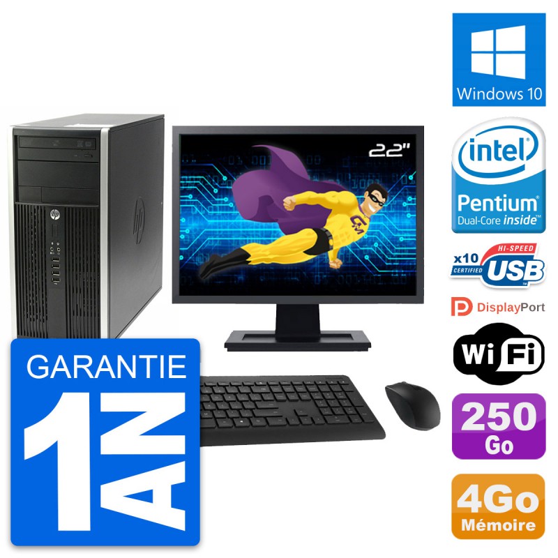PC HP Pro 6200 CMT (Micro Tour) - Intel Pentium Dual-Core G630 2.7 Ghz (3 Mo) - 4 Go DDR3 - Disque Dur 3,5" 250 Go - Graveur DVD - Clef Wifi USB - Windows 10 - Livré avec Ecran 22" + clavier + souris (Marques et modèles variables) - Garantie 1 an.