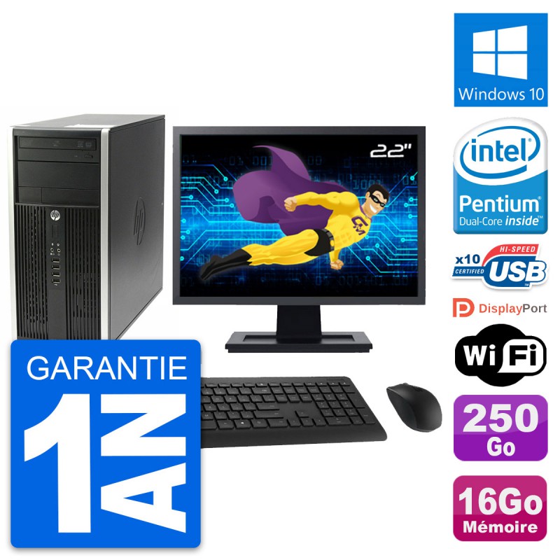 PC HP Pro 6200 CMT (Micro Tour) - Intel Pentium Dual-Core G630 2.7 Ghz (3 Mo) - 16 Go DDR3 - Disque Dur 3,5" 250 Go - Graveur DVD - Clef Wifi USB - Windows 10 - Livré avec Ecran 22" + clavier + souris (Marques et modèles variables) - Garantie 1 an.