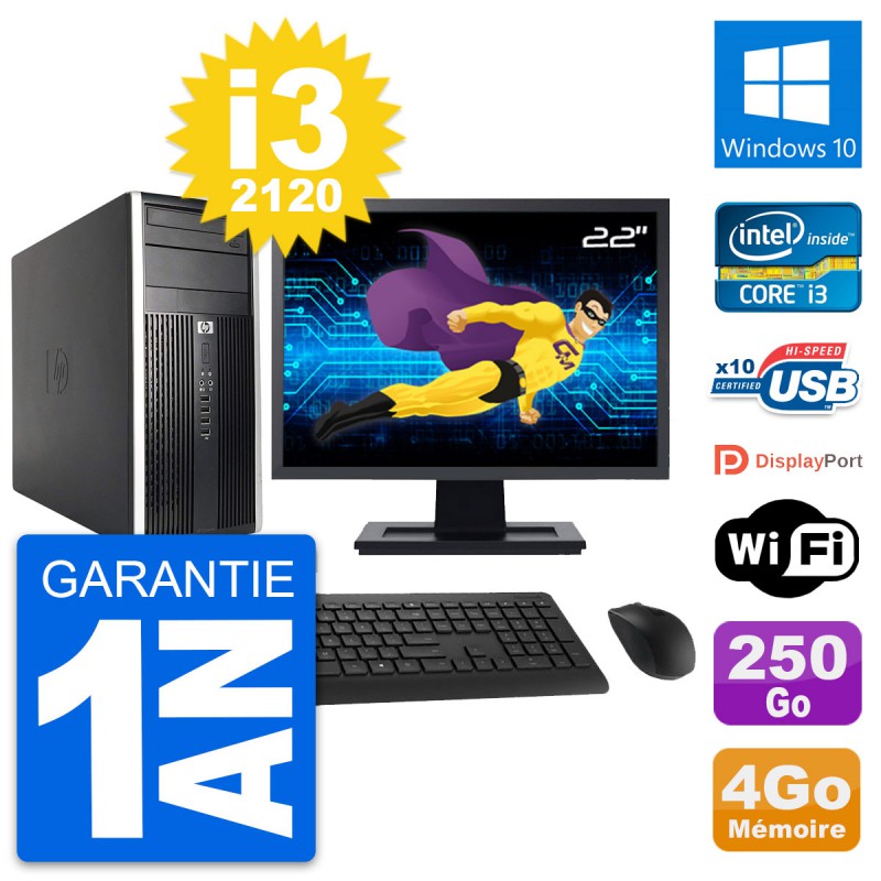 PC HP Pro 6200 CMT (Micro Tour) - Intel Core i3-2120 3.3 Ghz (3 Mo) - 4 Go DDR3 - Disque Dur 3,5" 250 Go - Graveur DVD - Clef Wifi USB - Windows 10 - Livré avec Ecran 22" + clavier + souris (Marques et modèles variables) - Garantie 1 an.