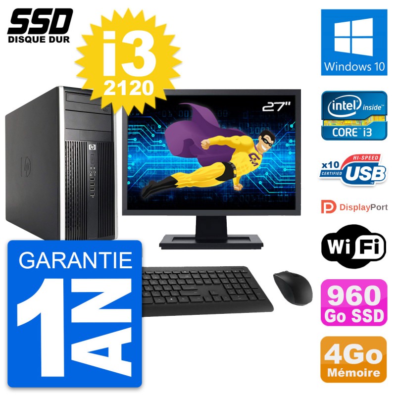 PC HP Pro 6200 CMT (Micro Tour) - Intel Core i3-2120 3.3 Ghz (3 Mo) - 4 Go DDR3 - Disque Dur SSD 960 Go - Graveur DVD - Clef Wifi USB - Windows 10 - Livré avec Ecran 27" + clavier + souris (Marques et modèles variables) - Garantie 1 an.