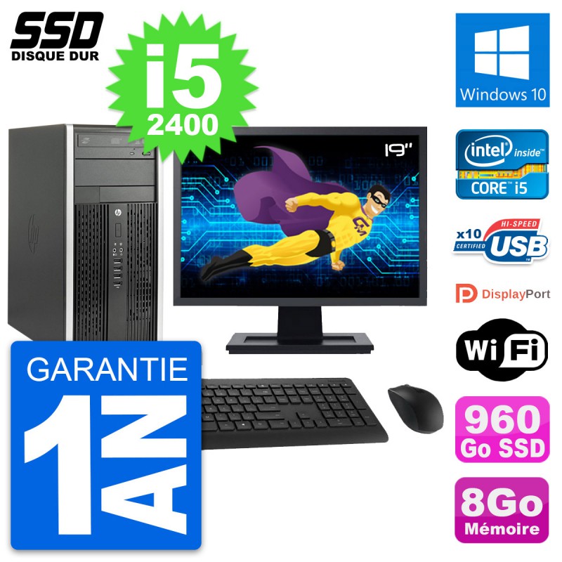 PC HP Pro 6200 CMT (Micro Tour) - Intel Core i5-2400 3.1 Ghz (6 Mo) - 8 Go DDR3 - Disque Dur SSD 960 Go - Graveur DVD - Clef Wifi USB - Windows 10 - Livré avec Ecran 19" + clavier + souris (Marques et modèles variables) - Garantie 1 an.