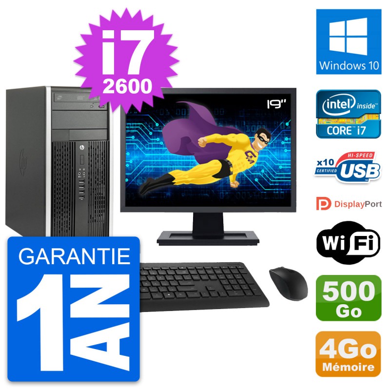 PC HP Pro 6200 CMT (Micro Tour) - Intel Core i7-2600 3.4 Ghz (8 Mo) - 4 Go DDR3 - Disque Dur 3,5" 500 Go - Graveur DVD - Clef Wifi USB - Windows 10 - Livré avec Ecran 19" + clavier + souris (Marques et modèles variables) - Garantie 1 an.