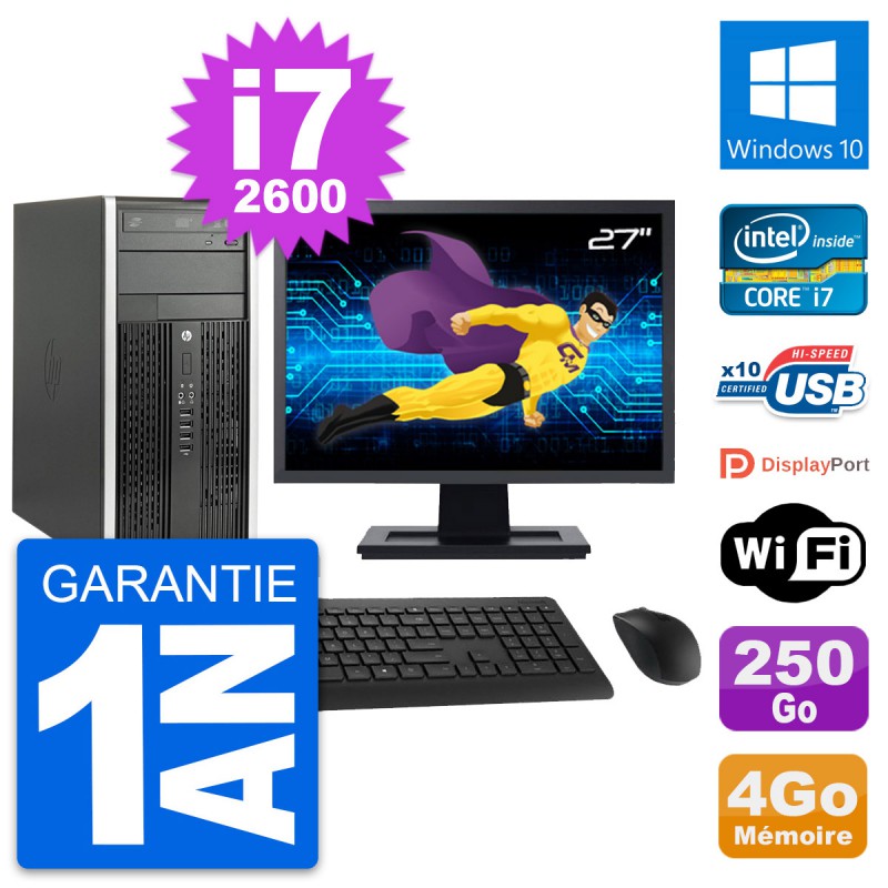 PC HP Pro 6200 CMT (Micro Tour) - Intel Core i7-2600 3.4 Ghz (8 Mo) - 4 Go DDR3 - Disque Dur 3,5" 250 Go - Graveur DVD - Clef Wifi USB - Windows 10 - Livré avec Ecran 27" + clavier + souris (Marques et modèles variables) - Garantie 1 an.