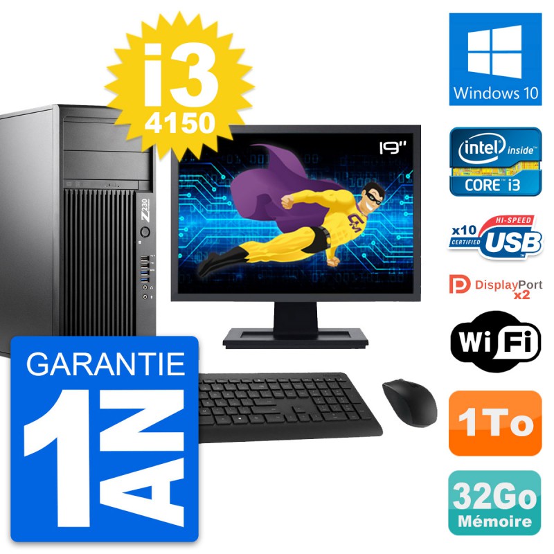PC Tour HP WorkStation Z230 - Intel Core i3-4150 3.5 Ghz (3 Mo) - 32 Go DDR3 - Disque Dur 3,5" 1 To - Graveur DVD - Clef Wifi USB - Windows 10 - Livré avec Ecran 19" + clavier + souris (Marques et modèles variables) - Garantie 1 an.