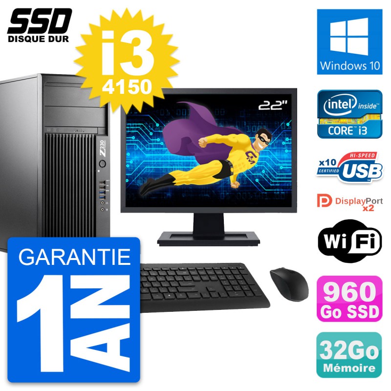 PC Tour HP Z230 Ecran 22" Intel Core i3-4150 RAM 32Go SSD 960Go Windows 10 Wifi