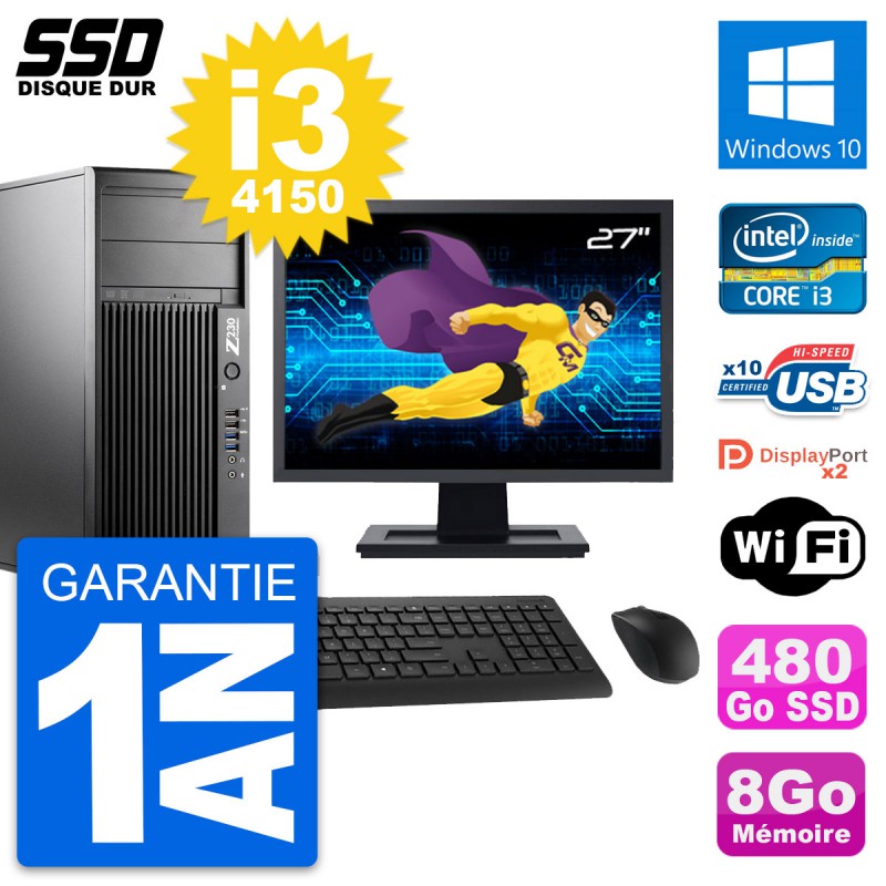 PC Tour HP WorkStation Z230 - Intel Core i3-4150 3.5 Ghz (3 Mo) - 8 Go DDR3 - Disque Dur SSD 480 Go - Graveur DVD - Clef Wifi USB - Windows 10 - Livré avec Ecran 27" + clavier + souris (Marques et modèles variables) - Garantie 1 an.