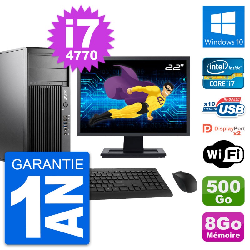 PC Tour HP WorkStation Z230 - Intel Core i7-4770 3.4 Ghz (8 Mo) - 8 Go DDR3 - Disque Dur 3,5" 500 Go - Graveur DVD - Clef Wifi USB - Windows 10 - Livré avec Ecran 22" + clavier + souris (Marques et modèles variables) - Garantie 1 an.