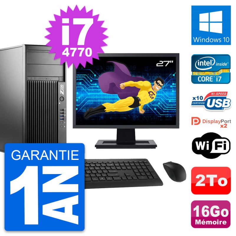 PC Tour HP WorkStation Z230 - Intel Core i7-4770 3.4 Ghz (8 Mo) - 16 Go DDR3 - Disque Dur 3,5" 2 To - Graveur DVD - Clef Wifi USB - Windows 10 - Livré avec Ecran 27" + clavier + souris (Marques et modèles variables) - Garantie 1 an.