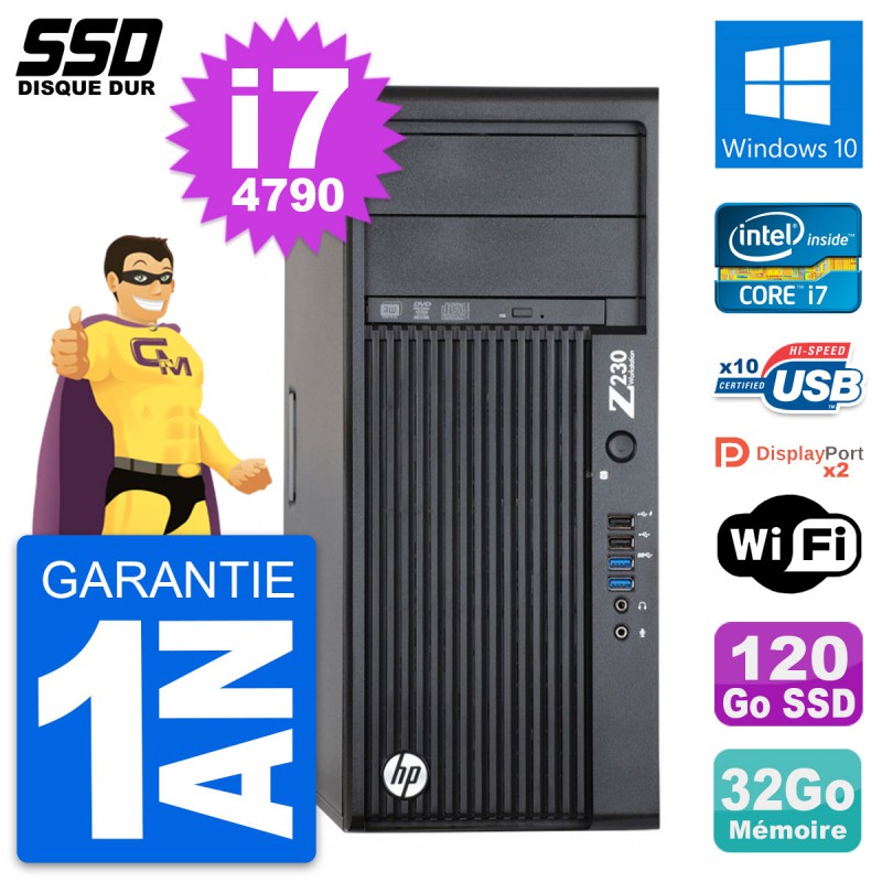 PC Tour HP WorkStation Z230 - Intel Core i7-4790 3.6 Ghz (8 Mo) - 32 Go DDR3 - Disque Dur SSD 120 Go - Graveur DVD - Clef Wifi USB - Windows 10 - Garantie 1 an.