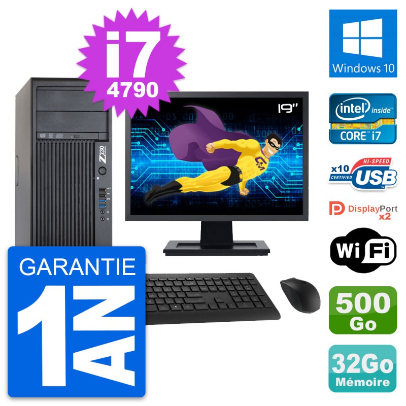 PC Tour HP WorkStation Z230 - Intel Core i7-4790 3.6 Ghz (8 Mo) - 32 Go DDR3 - Disque Dur 3,5" 500 Go - Graveur DVD - Clef Wifi USB - Windows 10 - Livré avec Ecran 19" + clavier + souris (Marques et modèles variables) - Garantie 1 an.