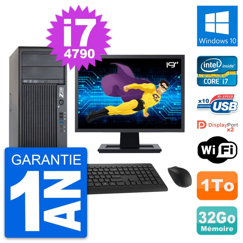 PC Tour HP WorkStation Z230 - Intel Core i7-4790 3.6 Ghz (8 Mo) - 32 Go DDR3 - Disque Dur 3,5" 1 To - Graveur DVD - Clef Wifi USB - Windows 10 - Livré avec Ecran 19" + clavier + souris (Marques et modèles variables) - Garantie 1 an.