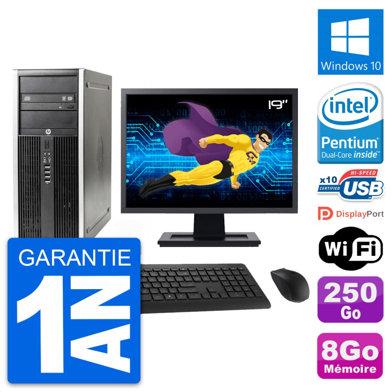PC Tour HP 8300 Elite - Intel Pentium Dual-Core G630 2.7 Ghz (3 Mo) - 8 Go DDR3 - Disque Dur 3,5" 250 Go - Graveur DVD - Clef Wifi USB - Windows 10 - Livré avec Ecran 19" + clavier + souris (Marques et modèles variables) - Garantie 1 an.