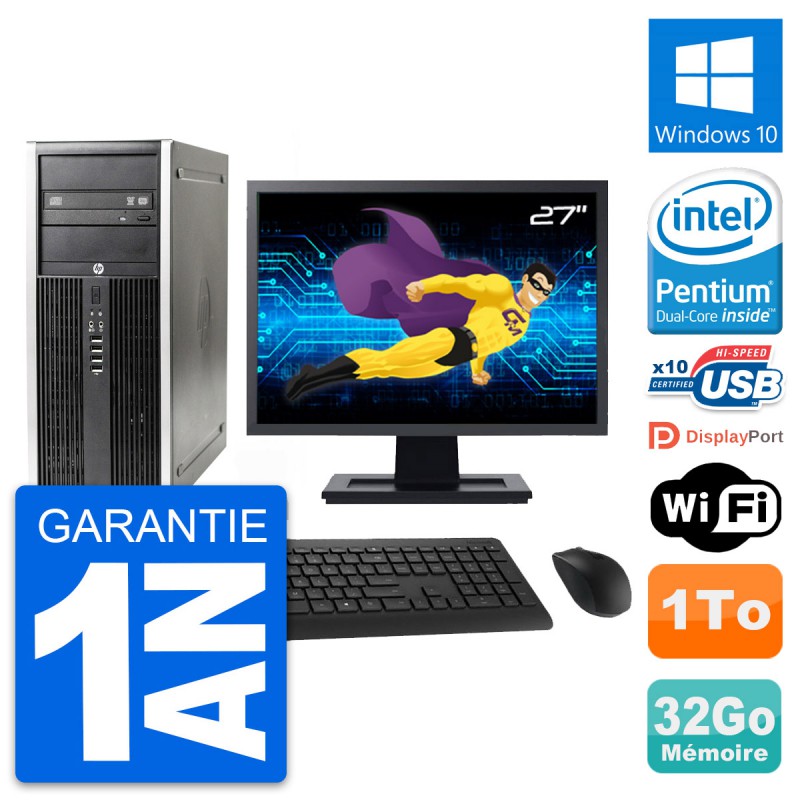 PC Tour HP 8300 Elite - Intel Pentium Dual-Core G630 2.7 Ghz (3 Mo) - 32 Go DDR3 - Disque Dur 3,5" 1 To - Graveur DVD - Clef Wifi USB - Windows 10 - Livré avec Ecran 27" + clavier + souris (Marques et modèles variables) - Garantie 1 an.