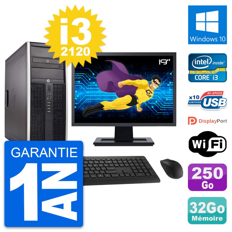 PC Tour HP 8300 Ecran 19" Intel i3-2120 RAM 32Go Disque 250Go Windows 10 Wifi
